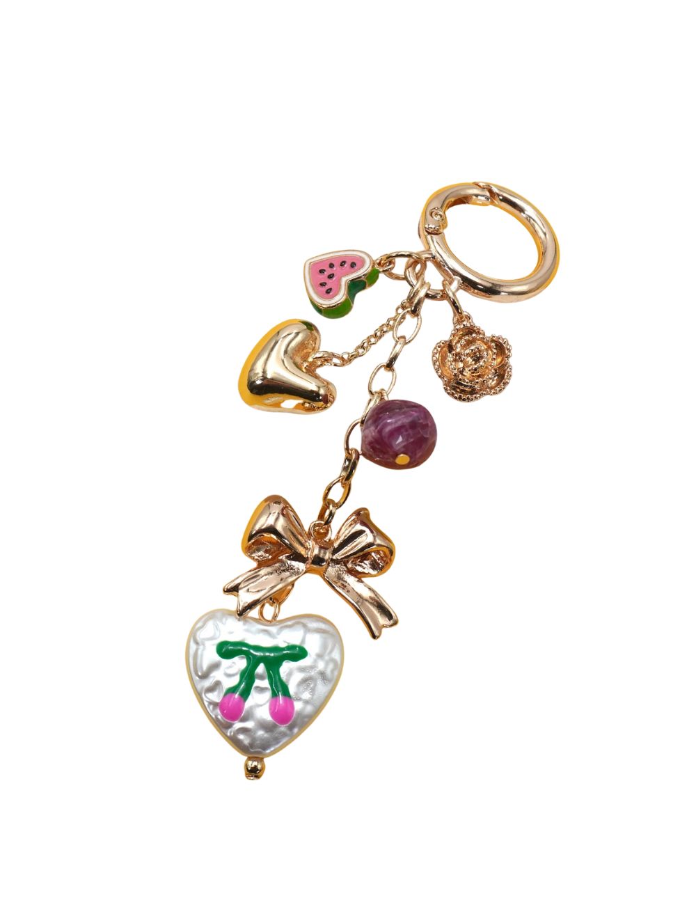 Apportez une touche unique à votre sac avec ce charmant bijou de sac, mêlant avec fantaisie cœur doré, nœud élégant, fleur délicate, perle colorée, pastèque émaillée et pendentif cœur nacré orné de cerises. Un ensemble ludique de charms en métal et acrylique, pour un effet visuel irrésistible.