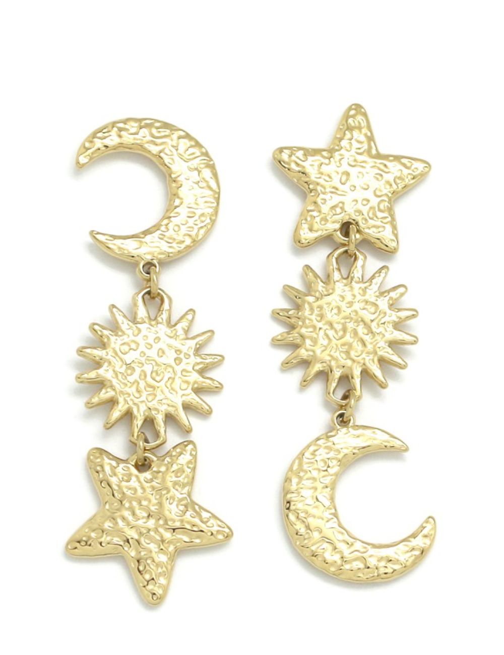 Profitez d'un look audacieux et élégant avec les boucles Cosmos. Leur design en forme de lunes et d'étoiles et leur fini martelé ajoutent une touche mystique à n'importe quelle tenue. Les boucles XL attirent l'attention et font une déclaration de style unique.