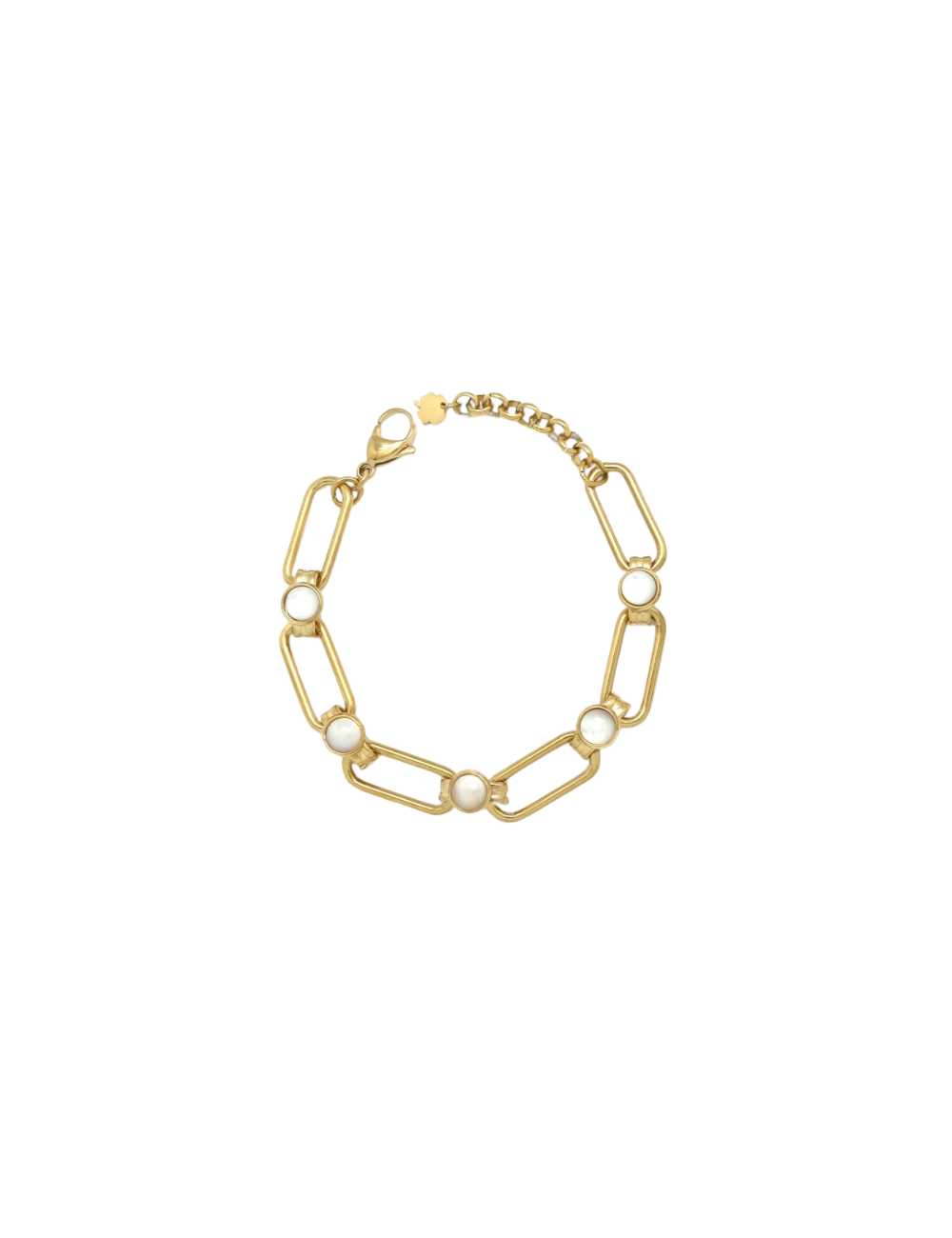 Un bijou doré à la fois graphique et spirituel, ponctué de petites pierres naturelles aux nuances profondes — bleu nuit, vert mousse, cornaline, brun doré… Chaque pierre est sertie dans une monture ronde reliée par de larges maillons rectangulaires, créant un équilibre subtil entre force et délicatesse.