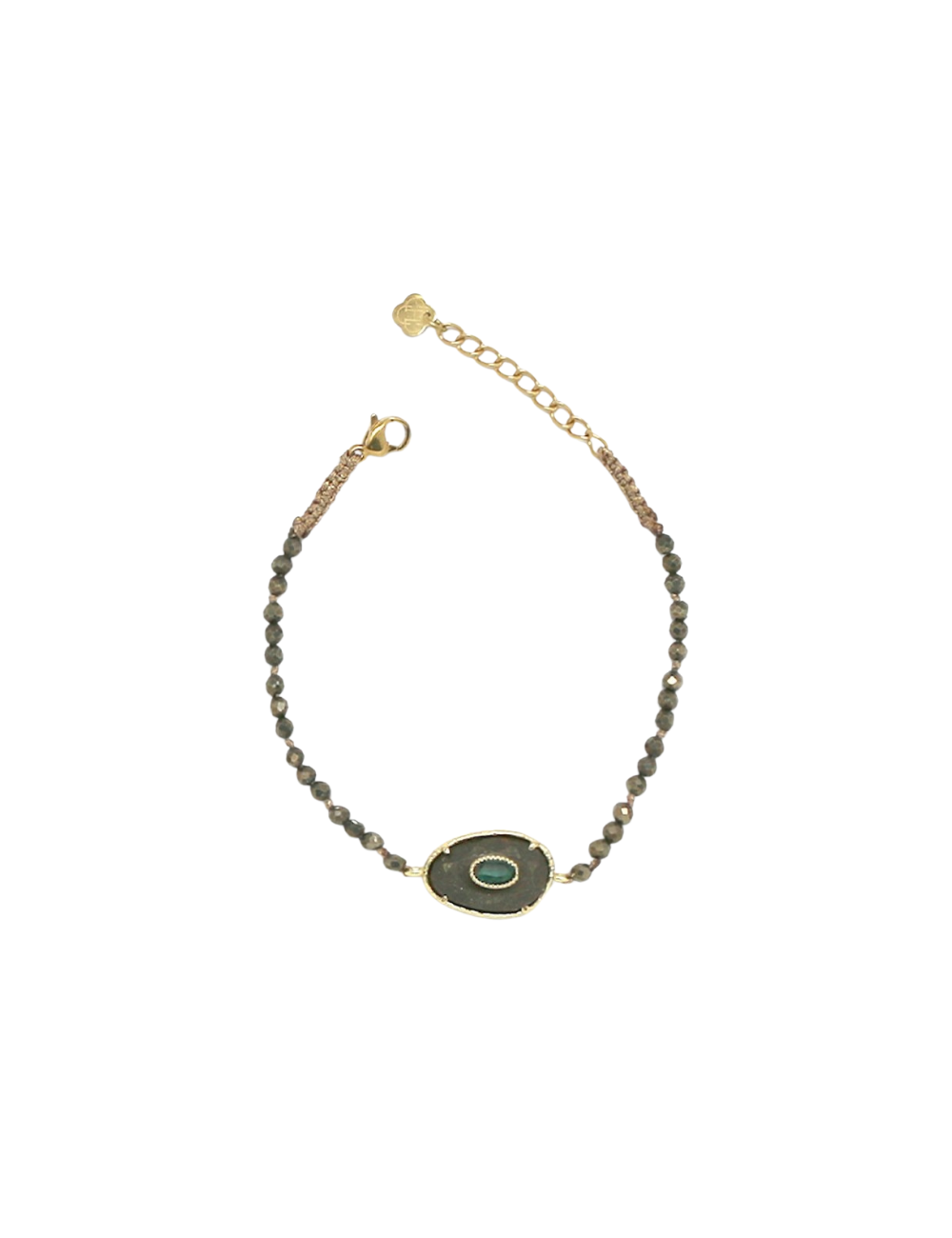 Un bijou délicat et mystique, pensé comme un talisman discret. Au centre, une pierre ovale aux reflets verts profonds est sertie dans une monture dorée irrégulière, rappelant les bijoux anciens façonnés à la main.