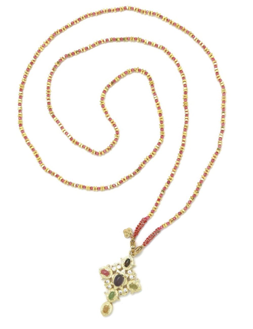 Sautoir en perles de tourmaline rose, orné d’une croix sertie de pierres multicolores. Chaque gemme apporte sa nuance et son éclat, pour une pièce vibrante et singulière. À porter long, en superposition ou noué.