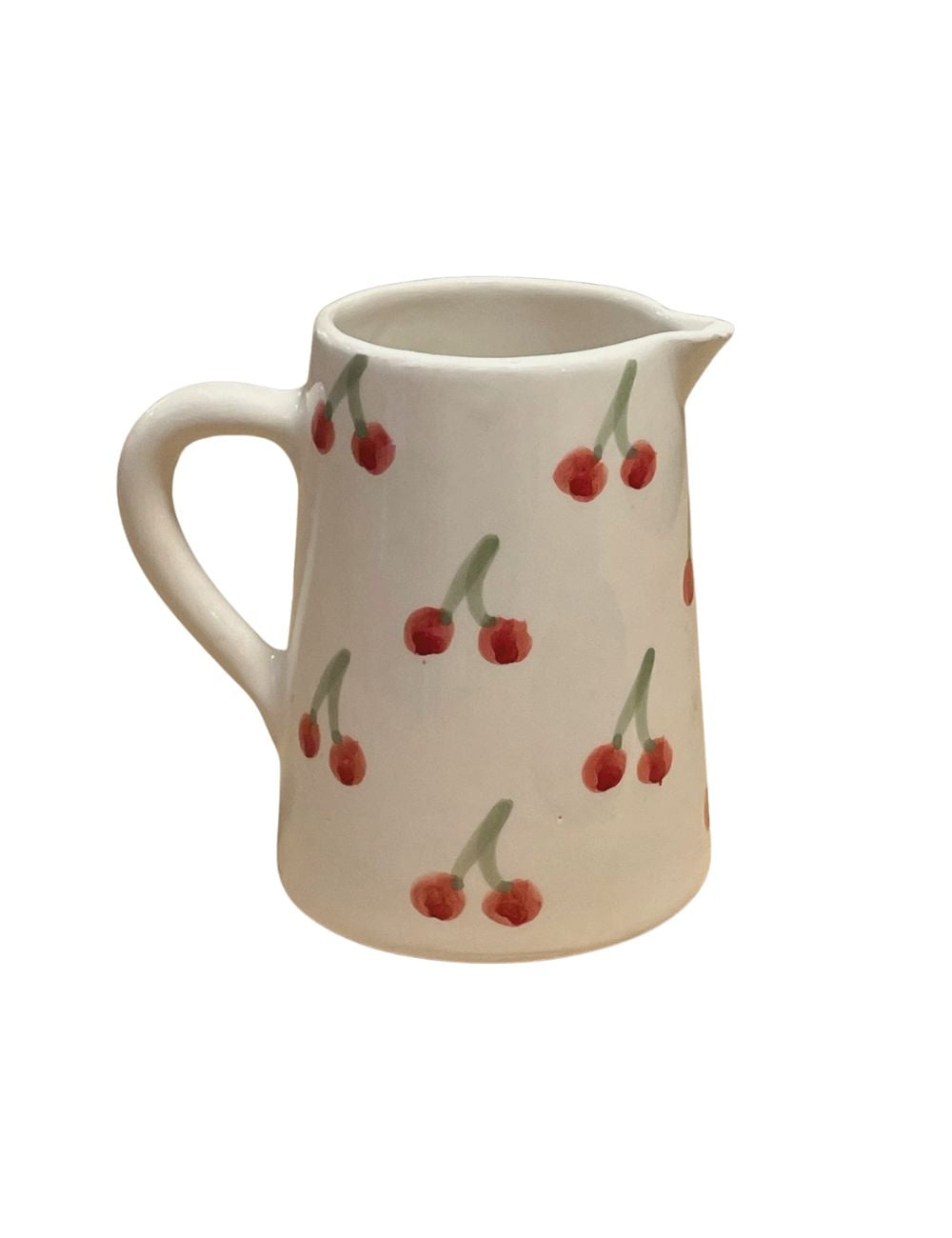 Ajoutez une touche joyeuse et rafraîchissante à votre table avec ce pichet en céramique délicatement peint à la main. Son fond blanc éclatant contraste avec les petits motifs de cerises rouges, apportant une note estivale et ludique à vos repas.
