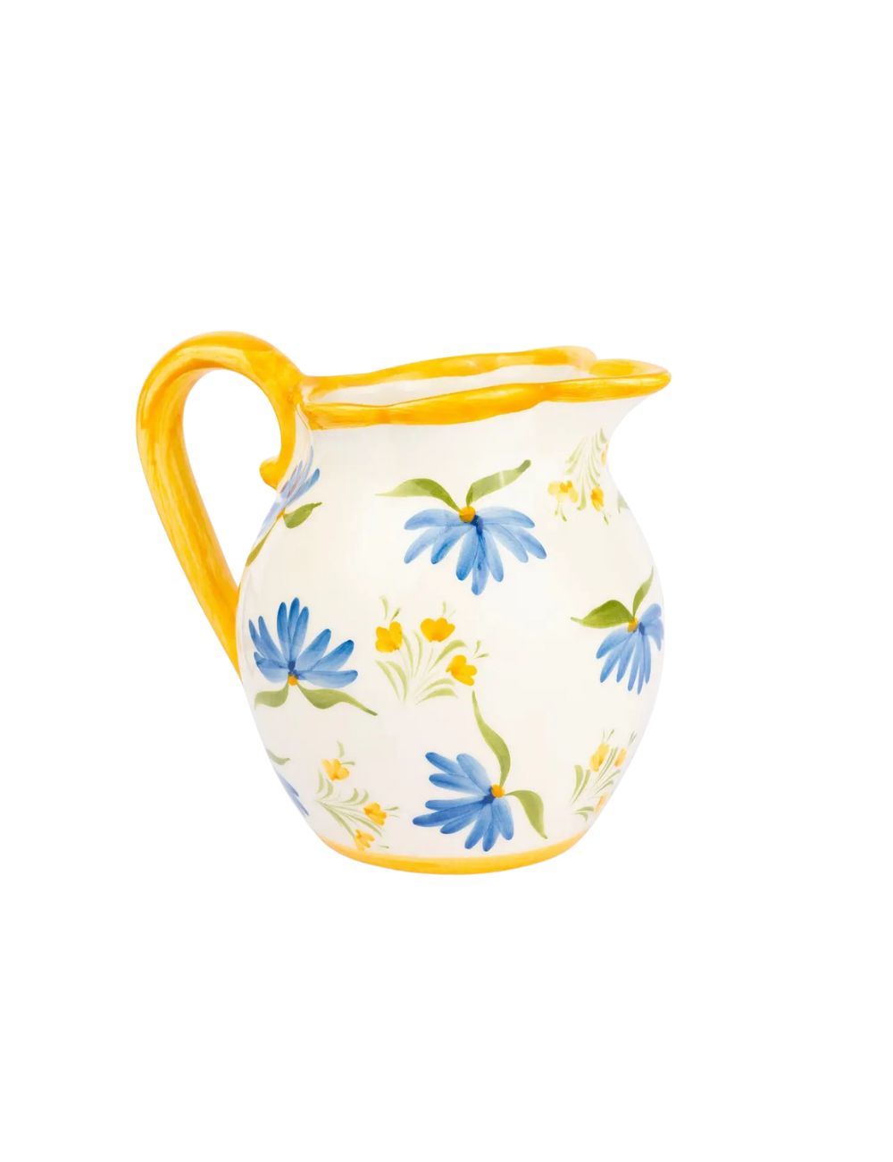 Ce pichet en céramique émaillée est une ode à la campagne italienne. Orné de fleurs bleues et jaunes peintes à la main, il évoque les petits-déjeuners au soleil, les tablées d’été et les bouquets sauvages fraîchement cueillis. Sa forme généreuse et son anse arrondie, soulignées d’un jaune lumineux, en font un objet aussi pratique que décoratif.