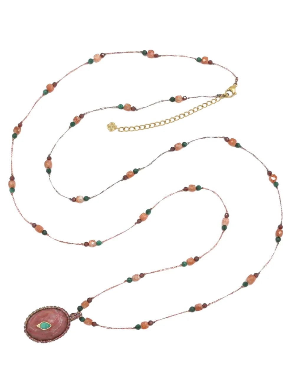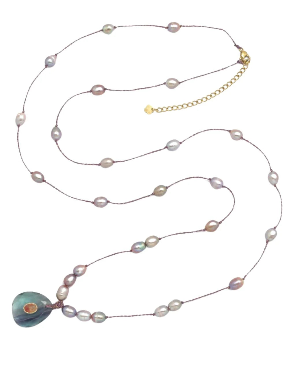 Le sautoir Alya est un bijou léger et vibrant, ponctué de pierres naturelles multicolores montées sur un fil teinté de rose. En son centre, un cœur taillé dans une pierre bleue translucide est orné d’un détail doré en forme de goutte. Ludique et lumineux, il se porte long ou doublé, pour illuminer un décolleté ou relever une tenue simple.
