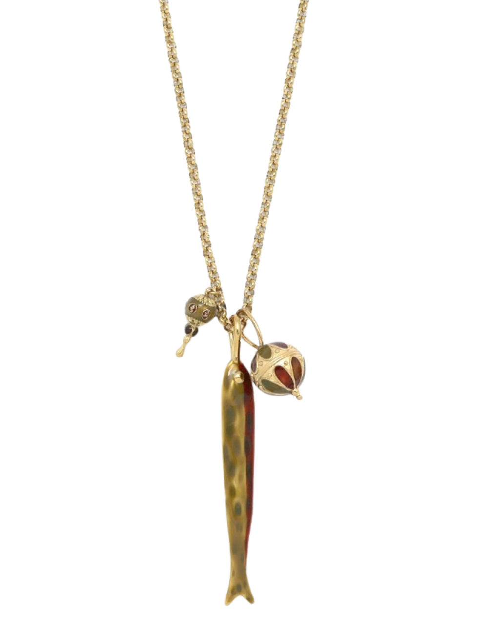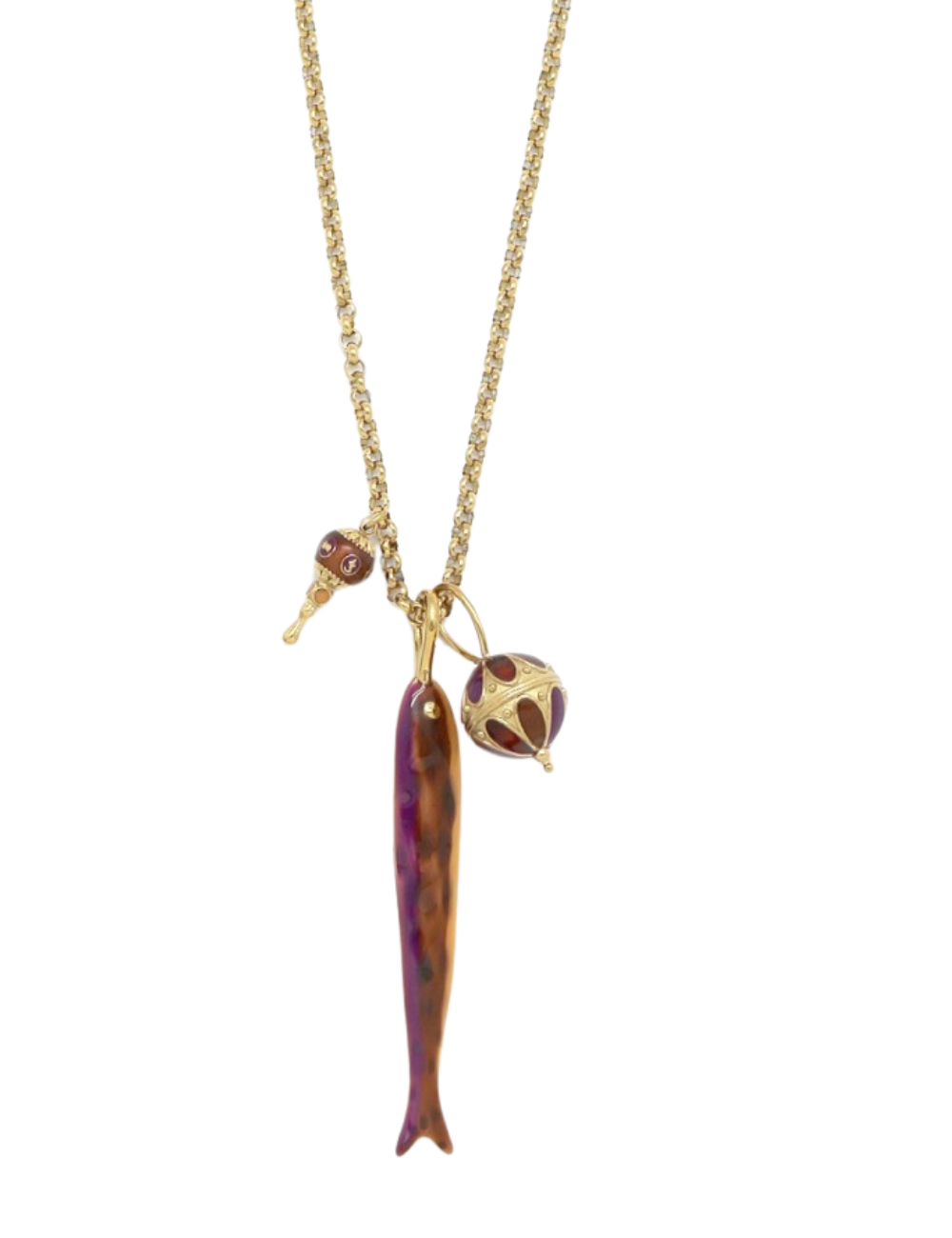 Sautoir en maille jaseron dorée, rehaussé d’un pendentif poisson émaillé et de breloques assorties. Un bijou plein de caractère, à porter seul ou en accumulation. Existe en 2 coloris
