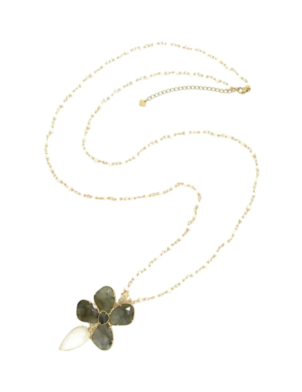 Le sautoir Lina est un bijou floral et poétique, composé d’une fine chaîne ornée de petites perles nacrées et terminé par un pendentif en forme de fleur, serti de pierres naturelles aux teintes profondes. Disponible en deux variantes, il se porte long, seul ou en accumulation, comme une déclaration bohème.