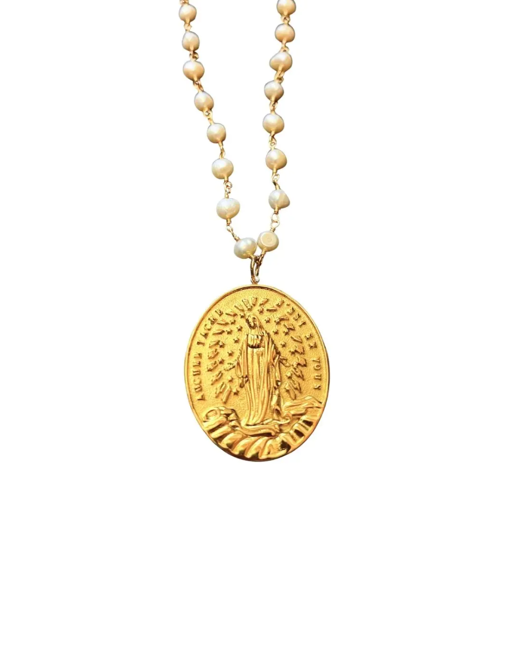 « Aucune tache n'est en vous » Depuis la disparition de notre pendentif XL de la Vierge en quartz, je cherchais une nouvelle variante de la médaille miraculeuse en grand format.C'est alors que je suis tombé sur cette médaille, une variante de la médaille miraculeuse réalisée au début du XIXe siècle par une paroisse que je n'ai pas identifiée. Une version plus singulière et épurée de la Vierge, simplement entourée d'étoiles et de rayons, écrasant le serpent comme sur l'original. Mais au-delà de son caractère unique, j'ai été frappé par le message, différent de la prière classique où c'est Marie qui est évoquée comme « conçue sans péché ». Plus sobre et moins solennel, il semble s'adresser à celui qui la porte, « aucune tache n'est en toi », et véhicule un symbolisme plus large. Il évoque la force qui est en nous, notre résilience et notre valeur face à l'adversité.Ce collier de perles blanches est orné du pendentif Maria, une médaille en acier inoxydable plaqué or de 4 x 3 cm. La chaîne mesure 60 cm.