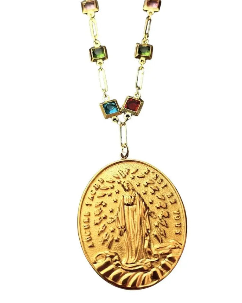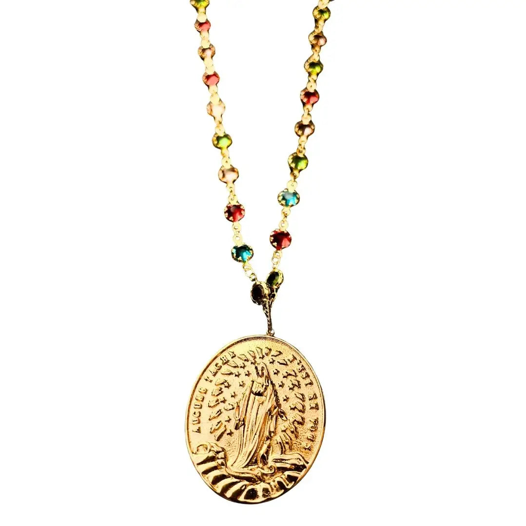 Depuis la disparition de notre pendentif XL de la Vierge en quartz, je cherchais une nouvelle variante de la médaille miraculeuse en grand format.C'est alors que je suis tombé sur cette médaille, une variante de la médaille miraculeuse réalisée au début du XIXe siècle par une paroisse que je n'ai pas identifiée. Une version plus singulière et épurée de la Vierge, simplement entourée d'étoiles et de rayons, écrasant le serpent comme sur l'original. Mais au-delà de son caractère unique, j'ai été frappé par le message, différent de la prière classique où c'est Marie qui est évoquée comme « conçue sans péché ». Plus sobre et moins solennel, il semble s'adresser à celui qui la porte, « aucune tache n'est en toi », et véhicule un symbolisme plus large. Il évoque la force qui est en nous, notre résilience et notre valeur face à l'adversité.Ce collier de perles blanches est orné du pendentif Maria, une médaille en acier inoxydable plaqué or de 4 x 3 cm. La chaîne mesure 60 cm.