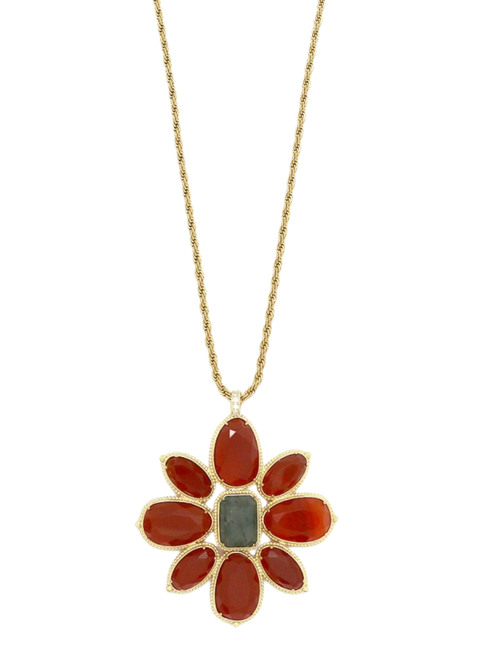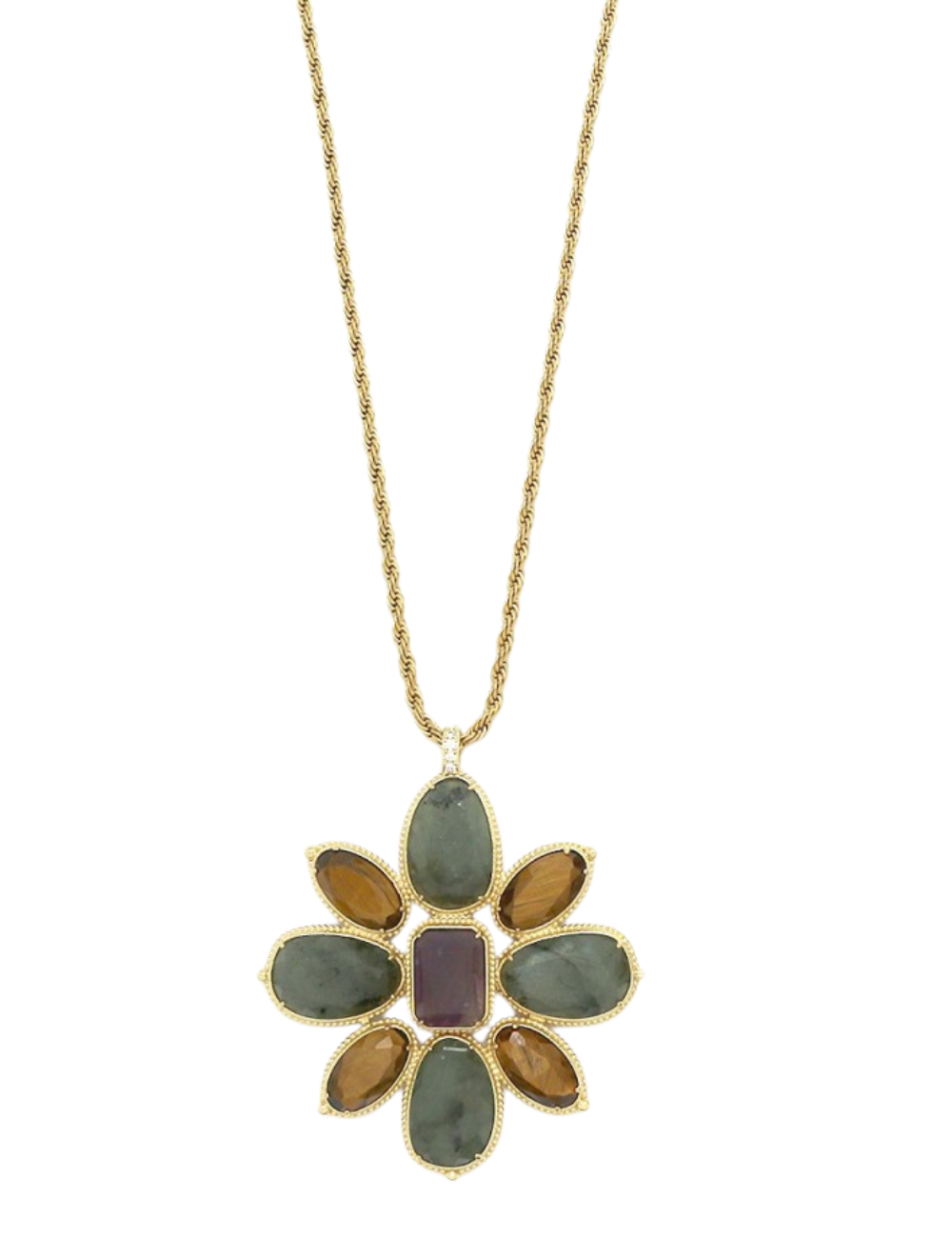 Ce sautoir précieux célèbre la beauté des pierres naturelles à travers un grand pendentif floral aux reflets chatoyants. Chaque pétale facetté capte la lumière avec intensité, tandis que la pierre centrale contraste subtilement pour créer un jeu d’harmonie et de profondeur.